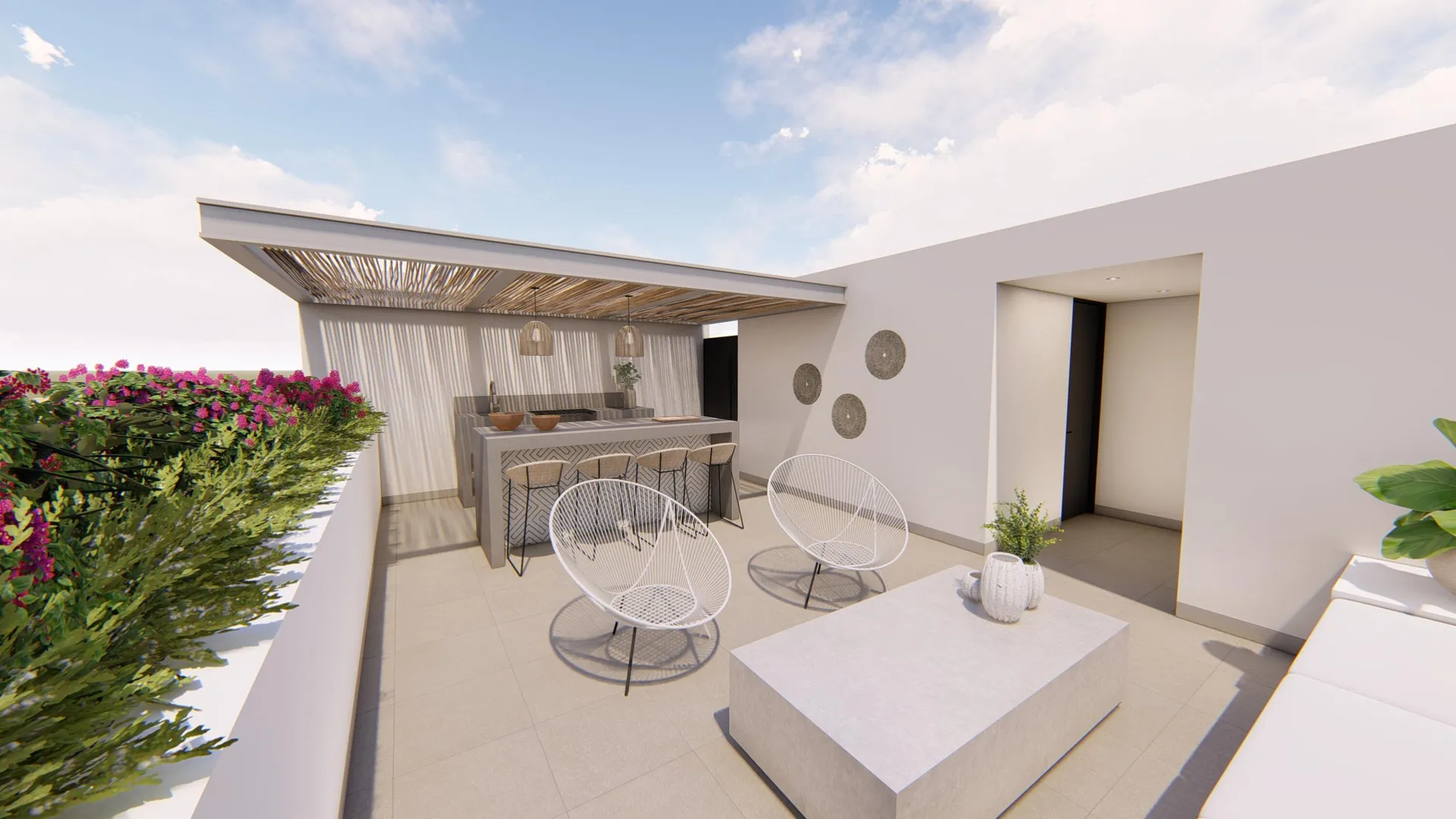 Moderno PH+RoofTop, 3er piso, 2 recámaras, 2 baños, sala, comedor, cocina integral, lavandería + 52 M2 de roof top terrace con área de asador, pérgola, sala de material, bodega y ½ baño. Áreas comunes: Alberca, pérgola con/asador y lindas áreas verdes para disfrutar tu vida diaria en confort y estilo. Escuelas, hospitales, supermercados y plazas comerciales cercanas y convenientes que facilitarán tu día a día. **Sophisticated PH+RoofTop, located on the 3rd fl. 2B+2B, living room, dining room, full kitchen, laundry room, plus 52 M2 of roof top terrace w/BBQ area, pergola, concrete living, storage and 1⁄2 bathroom. Common areas: Pool, pergola with/grill and beautiful green areas to enjoy your daily life in comfort and style. Schools, hospitals, supermarkets and shopping malls nearby.
